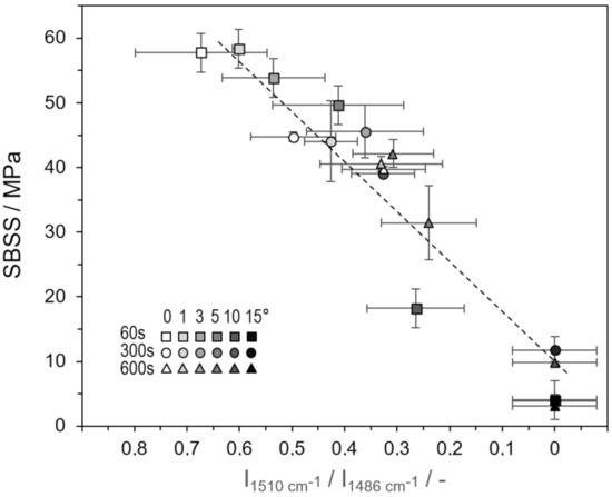 Thermally loaded samples are investigated for their residual short beam shear strength (SBSS). SBSS was chosen for mechanical testing, because the small area of thermal damage induced by the heat gun is best represented by the small samples (20 mm × 10 mm), and SBSS is less influenced by specimen geometry, for example, compared to the influence of the out-of-plane fibre angle on tensile strength (see above). Figure 18A presents the SBSS dependent on loading time. The drop in residual strength due to thermal loading is similar for samples with out-of-plane fibre angles between 0° and 3° within measurement tolerance. These samples lose one third of their initial SBSS after 600 s, whereas samples with out-of-plane fibre angles higher than 5° already completely degrade with respect to residual strength after 60 s of thermal treatment. An explicit comparison of residual strength is only possible for each fibre angle between various loading times (see Figure 18B), in order to not only consider the influence by the changing damage mechanism for various out-of-plane fibre angles. Within this comparison the relative decrease in SBSS is also similar up to an out-of-plane fibre angle of 3°. For angles higher than 3°, degradation is more pronounced with increasing angles. For 15°, residual strength is nearly completely lost after 60 s. In other words, loading time shows a significant influence on the residual SBSS of samples with low out-of-plane fibre angles, whereas for high fibre angles degradation is faster, and loading time is less decisive for the chosen conditions. In principle, the loss of SBSS can be correlated to matrix decomposition. Therefore, a first insight is given by the µCT analysis presented in Figure 12 and Figure 13. More precisely, for the less decomposed matrix, the degradation of the polymer at the samples´ back side is correlated to residual SBSS in Figure 19 by means of infrared spectroscopy. In Figure 19, all samples are shown together with IR data representing position 1 on their back sides including all out-of-plane fibre angles and loading durations. Position 1 best represents back side conditions for a larger component and typically stands for the most pronounced degradation compared to positions 2 and 3. With increasing matrix degradation, which corresponds to a decreasing intensity ratio, I1510 cm−1/I1486 cm−1, the residual SBSS, in principle, diminishes. This correlation comprises the increasing degradation of the matrix with the duration of thermal load and increasing out-of-plane fibre angle (see shaded symbols in Figure 19). Both duration and out-of-plane fibre angle significantly influence matrix degradation and residual SBSS. The correlation can be, in principle, used to non-destructively estimate the residual SBSS of a component with out-of-plane fibre angles. By measuring infrared spectra at the samples´ back side, an empirical prediction of mechanical performance can be achieved rapidly. However, standard deviations for the determined intensity ratios of the characteristic infrared bands are quite high, leading to not very precise estimations.