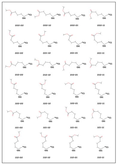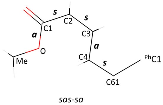 To differentiate the 24 remaining conformers while keeping a reasonably short trivial name, we propose the following nomenclature. In parentheses, prefix [60]PCBM with the five relative orientations about the bonds in the ester group, which are designated “s” for syn and “a” for anti with respect to the relevant single bonded heavy elements of the addend that lie on the mirror plane. We present them in the following order: C61-C4, C4-C3, C3–C2, C2–C1 and C1–O, and place a hyphen after the third bond to differentiate the conformational behaviour of the alkyl chain from that of the ester end.