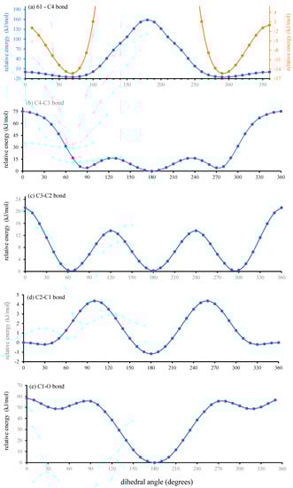 The greater variation away from the ideal gauche angle than that seen for the C61–C4 bond above is due to the even greater asymmetry in the barriers. On this occasion, the barrier for rotation from gauche(’) to anti is 12.18 kJ/mol (126.3 meV, 4.91 × kT at RT), and that to rotate from anti to gauche(’) is 16.32 kJ/mol (169.2 meV, 6.58 × kT at RT).