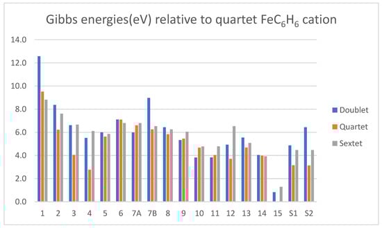 We did not trace out a full reaction path network for the Fe system, but we can identify some possible landmarks (relative minima in Gibbs energy). If the reaction branches from the quartet of the species 3 cation with an unbound acetylene at 4.0 eV, then the quartets of species 10–14 are within relatively easy reach. We note that all spin states of species 14 are higher in energy than the quartet of species S1. The quartet and sextet of S2 return upon the reoptimization to the C2v structure of S1.