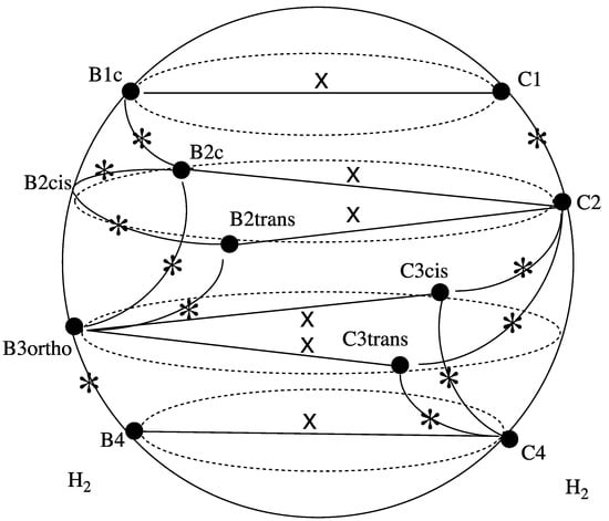 Reaction path network for osmium-catalyzed production of H2 from OsC6H6 cation. A sphere (outlined by the solid circle) is sliced to define four planes intersecting the sphere as shown by dotted lines. These planes contain species labeled X = B and C with indices 1, 2, 3, and 4 in sequence from top to bottom. The number of H atoms attached to Os are 0, 1, and 2 for X1, X2, and X3; X4 refers to OsC6H4 cation. Interconversions of bicyclic species (BB paths) appear on the left; interconversions of monocyclic species (CC paths) appear on the right. Transition states are each marked with an asterisk *. Interconversions of monocyclic and bicyclic species follow BC paths with transition states marked by X.