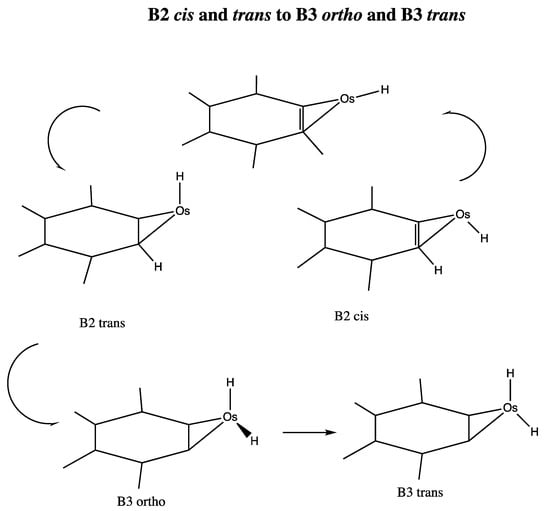 The second H transfer passes over a small barrier to produce a structure we call “ortho”, B3, with the two Os–H bonds, perpendicular and parallel to the molecule’s C6H4 hydrocarbon plane, respectively. (See Figure 6.) The cis and trans isomers of bicyclic H2OsC6H4 are very close in energy to the ortho form; they can be easily interconverted.
