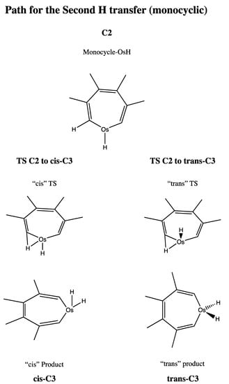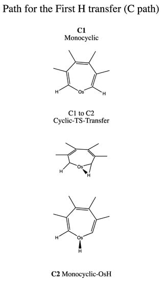 An alternative path for hydrogen extrusion may be traced from monocyclic 1-Osma-cyclohepta 2,4,6-triene (Species 14 in Figure 1 above). We call this structure C1. Gibbs energies in Hartrees and the relative energies in eV are collected in Table 2. C1 lies at 1.518 eV relative to the C6v cationic complex of Os with benzene. The first H transfer to Os shown in Figure 8 generates species C2 at 1.236 eV, after passing through a TS at 2.243 eV; that is, over a barrier of 0.725 eV.