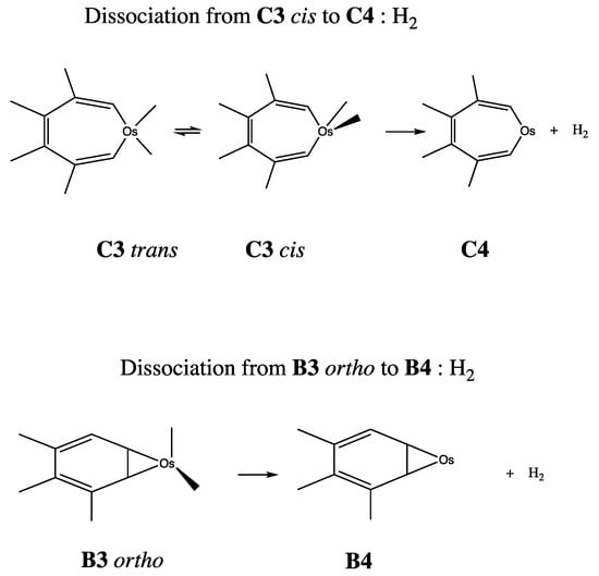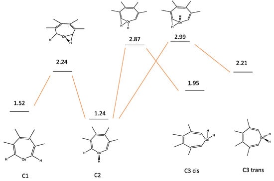 3.4.4. Overview of the C Reaction Path for H2 Extrusion from 1-Osma-cyclohepta 2,4,6-triene (C1)