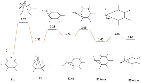 B2 cis and B2 trans can be interconverted by the clockwise or anticlockwise twist of the torsion angle C–C–Os–H around an Os–C bond. The lower energy path (with a TS at 2.039 eV) breaks an Os–C bond entirely and detaches the Os atom from the phenyl ring, while the higher energy path (with a TS at 2.202 eV) only weakens the Os–C bond to the hydrogenated alpha C so that the bicyclic nature of the structure is preserved and the Os atom stays above the phenyl plane.