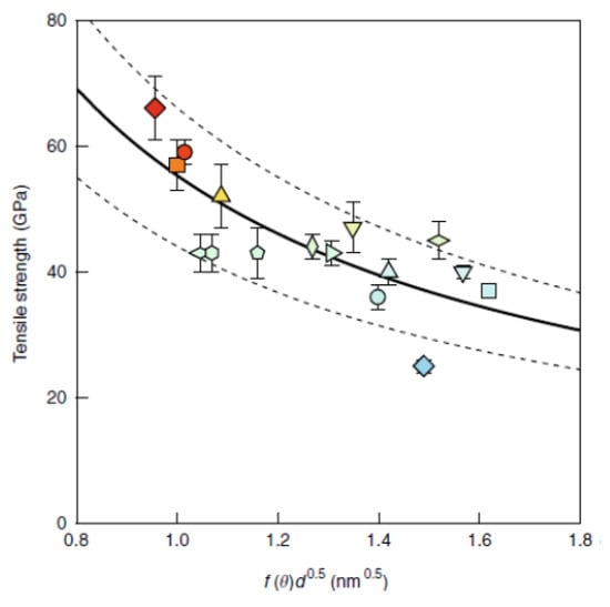 - Yu, M.-F.; Lourie, O.; Dyer, M.J.; Moloni, K.; Kelly, T.F.; Ruoff, R.S. Strength and Breaking Mechanism of Multiwalled Carbon Nanotubes Under Tensile Load. Science 2000, 287, 637–640. [Google Scholar] [CrossRef] [PubMed] [Green Version]