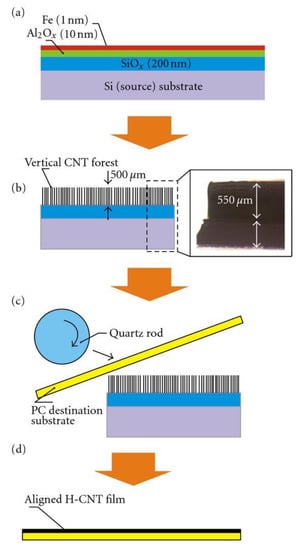 - Cole, M.; Hiralal, P.; Ying, K.; Li, C.; Zhang, Y.; Teo, K.; Ferrari, A.; Milne, W. Dry-Transfer of Aligned Multiwalled Carbon Nanotubes for Flexible Transparent Thin Films. J. Nanomater. 2012, 2012, 1–8. [Google Scholar] [CrossRef]