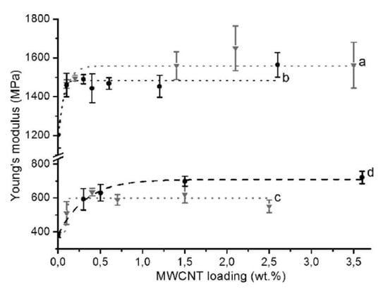- Coleman, J.N.; Khan, U.; Blau, W.J.; Gun’Ko, Y. Small but strong: A review of the mechanical properties of carbon nanotube–polymer composites. Carbon 2006, 44, 1624–1652. [Google Scholar] [CrossRef]