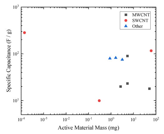 | MWCNT (acet. decomp.) | PVDF (bind.); acetylene black (cond.) | Pressing | 3.4–8.5 mg (85 wt% MWCNT, 4–10 mg total electrode mass) | Stainless steel | N/A | 6 M KOH | 4–135 | [93] |
