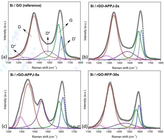 Fitted Raman spectra of GO (a), 2 s APPJ reduced GO (b), 5 s APPJ reduced GO (c), and 30 s RF plasma reduced GO (d) on Si substrates.