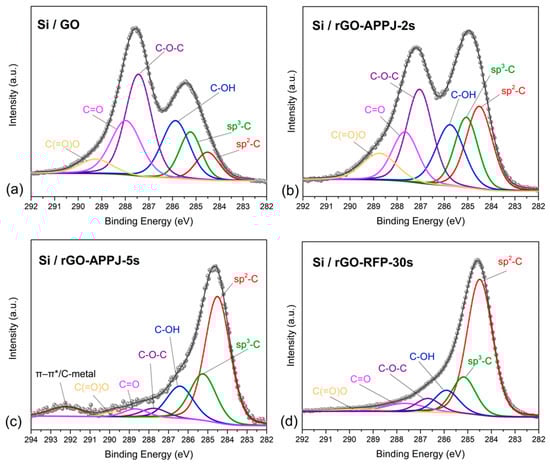 The XPS survey of the various GO is shown in the supplementary information, Figure S4. As expected, peaks arising from carbon (~284 eV) and oxygen (~531 eV) were observed along with silicon (99–169 eV) from the substrate. Interestingly, nitrogen signals were not found in the APPJ–processed GO samples, which were exposed to plasma containing nitrogen species. This suggested that nitrogen doping did not occur for the rGO. For samples treated with APPJ for 5 and 10 s, traces of iron (Fe) were found originating from the sample holder (supplementary information, Figure S4). Figure 2 presents the XPS core levels of the GO and various rGO. The chemical components identified from the spectra were sp2–hybridized carbon (sp2–C), sp3–hybridized carbon (sp3–C, C–C/C–H), hydroxyl-(C–OH), epoxide-(C–O–C), carbonyl-(C=O), and carboxyl-(CO(OH)) groups, respectively [,,,,,,]. For the sample rGO–APPJ–5s, a feature at binding energy >290 eV was distinctively observed. In the literature, this has been assigned to energy losses due to π–π * excitations, which is typical for carbonaceous systems with delocalized π–electrons [], as well as to carbon atoms bonded to metals [].