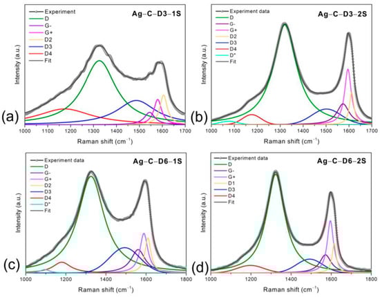 Fitted Raman spectra for carbon deposited on ZnO/Ag substrates at various nozzle-to-substrate distances and durations: (a) at 3 mm for 1 s, (b) at 3 mm for 2 s, (c) at 6 mm for 1 s, and (d) at 6 mm for 2 s.
