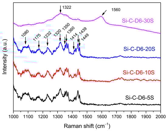It is known that native Si-wafers are oxidized from the surface. This oxide is very smooth and dense but not crystalline. We took this substrate for the next experiments to discard the template impact of a substrate. The dynamic linearly oscillating deposition was undertaken at the nozzle-to-substrate distance of 6 mm to avoid overheating the substrate. The Raman spectra of the carbon deposited on Si substrates are shown in Figure 4 and the peak assignments are summarized in Table 2. The carbon deposited for 2–20 s displayed a similar spectral feature, and their interpretation was not straightforward. Some prominently observed features in the spectra were the bands in the range 1050–1100 cm−1 coinciding with C–C stretching observed in hydrocarbon chains [,] and several peaks up to 1450 cm−1 which are observed in C60/C70-fullerene materials (see Table 2) [,].