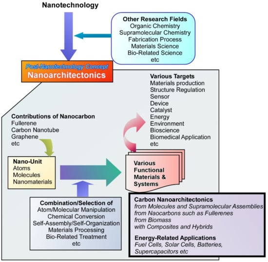 As a one-step advanced methodology, nanoarchitectonics has been recently proposed as a post-nanotechnology concept (Figure 1) [35,36]. This concept was initially proposed by Masakazu Aono [37,38]. Nanoarchitectonics is a concept based on the fusion of nanotechnology with other research fields such as organic chemistry, supramolecular chemistry, fabrication processes, materials science, and bio-related science [39,40]. It is the methodology to produce functional materials from nanoscale units through combination/selection of atom/molecular manipulation, chemical conversion, self-assembly/self-organization, materials processing, and bio-related treatments [41,42]. Because the basic concept in nanoarchitectonics is universally applicable to a wide range of materials, the nanoarchitectonics concepts have been used for various targets including materials production [43,44], structure regulation [45,46,47], sensors [48,49], devices [50,51], catalysts [52,53], energy [54,55], environment [56,57], bioscience [58,59,60], and biomedical applications [61,62,63]. Carbon-based materials such as fullerenes are also used in nanoarchitectonics approaches [64,65].