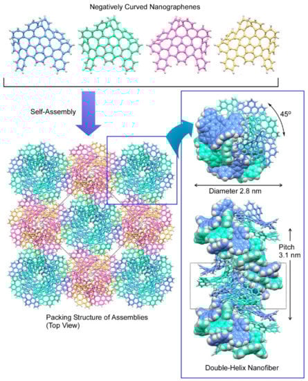 Formation of supramolecular double-helix nanofibers upon self-assembly of negatively curved nanographene. Reprinted with permission from Reference [76]. Copyright 2021 American Chemical Society.