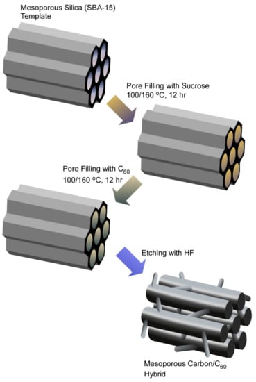 Preparation of mesoporous C60/carbon hybrid materials through nanotemplating method using mesoporous silica SBA-15 as a template.