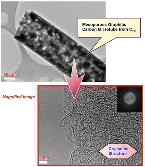 Fabrications of mesoporous crystalline fullerene (C70) microtubes with highly crystalline pore walls and their direct conversion into mesoporous graphitic carbon microtubes were also reported (Figure 7) [106]. First, mesoporous fullerene C70 tubes were synthesized using an ultrasonic liquid–liquid interfacial precipitation method. Briefly, fullerene C70 tubes were fabricated at the interface formed between the solution of fullerene (C70) in 1,2-dichlorobenzene and isopropyl alcohol, at 15 °C, followed by sonication and multiple washing to remove 1,2-dichlorobenzene completely. The fullerene C70 tubes were then used as a π-electron carbon source to produce high surface area mesoporous graphitic carbon with crystalline pore walls. Furthermore, direct conversion of fullerene C70 tubes was directly converted into mesoporous graphitic carbon microtubes by heat treatment at 2000 °C in a vacuum, with the initial one-dimensional tubular morphology retention. The walls of the resulting graphitic carbon microtubes are composed of ordered conjugated sp2 carbon with a robust mesoporous framework structure. The electrochemical supercapacitance performance of mesoporous graphitic carbon microtubes was studied (mesoporous graphitic carbon microtubes modified glassy carbon electrode in 1 M H2SO4) through cyclic voltammetry and chronopotentiometry (charge–discharge) measurements. It was found that this new carbon material exhibits high specific capacitance ca. 212.2 F g−1 at a scan rate of 5 mV s−1 and 184.6 F g−1 at a current density of 0.5 A g−1. It is believed that an innovative methodology towards the fabrication of a new type of nanoporous carbon material with graphitized frameworks would open up a new avenue for the fabrication of multifunctional carbon nanomaterials, which are not attainable by traditional approaches to prepare mesoporous/nanoporous carbons, for high-end applications such as solar cells, supercapacitors, hydrogen storage materials, and sensors.