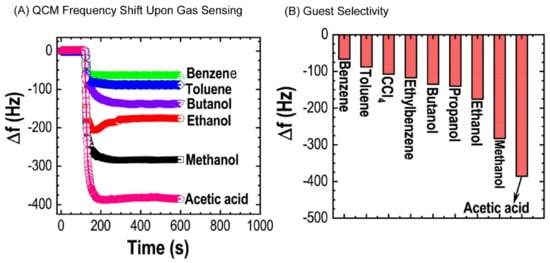 (A) QCM frequency shifts quartz crystal microbalance coated with nanoporous carbon upon exposure to methanol, ethanol, butanol, benzene, toluene, ethylbenzene, and acetic acid; (B) summary of sensing performance [109].