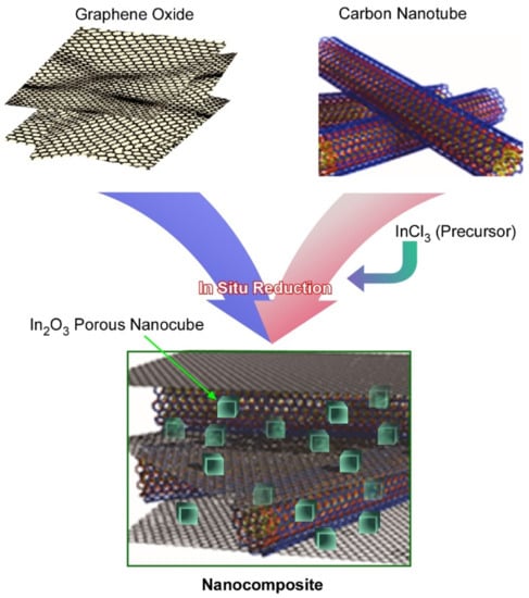 Fabrication of ternary nanocomposite material composed of mesoporous Indium oxide (In2O3) nanocubes embedded into carbon nanotubes and reduced graphene oxide.