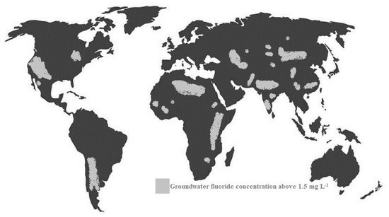 Geographical areas (in light grey) associated with groundwater fluoride concentration above 1.5 mg L−1 (recommended WHO level) of naturally occurring fluoride. The figure shows that areas in north and South America, Africa and Asia exhibit groundwaters with elevated fluoride concentrations.
