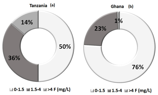 Percentage of fluoride existence in relation to local standards (a) Tanzania case; (b) Ghana case, in Africa [11].