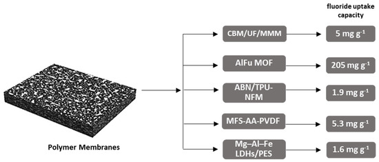Mg–Al–Fe layered double hydroxides/polyether sulfone MMM (Mg–Al–Fe LDHs/PES) [66] is another type of modified membrane produced for fluoride removal. According to the results of this study, the Mg–Al–Fe LDHs/PES membranes exhibited a high adsorption capacity for fluoride, i.e., 1.61 mg g−1. The membranes could be reused four times.