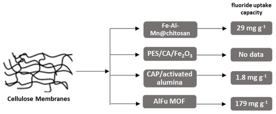 Schematic graph, depicting maximum fluoride uptake capacities (mg g−1) of presented. Cellulose-based membranes. MOF type materials show the highest efficiencies for fluoride removal.