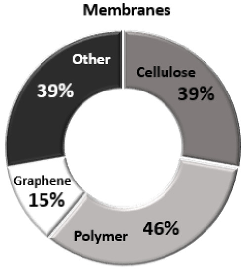 Analysing the reviewed data in this paper, relative to the percentage % of publications on each membrane category (Figure 7), it was observed that the main focus of the reviewed publications, has been on the use of polymer-based membranes, with 46%, followed by cellulose-based and other type modified membranes at the same percentage % of occurrence (39% of the total publications) and only some cases (~15%) of GO-based membranes have been examined. The studies are mainly focusing on the membranes technique effect on the performance of fluoride removal addressing their possible impact on human health and the environment.