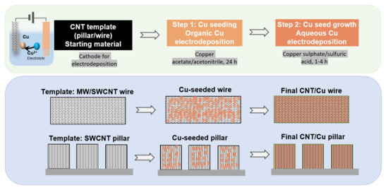 - Sundaram, R.; Yamada, T.; Hata, K.; Sekiguchi, A. The importance of carbon nanotube wire density, structural uniformity, and purity for fabricating homogeneous carbon nanotube–copper wire composites by copper electrodeposition. Jpn. J. Appl. Phys. 2018, 57, 04FP08. [Google Scholar] [CrossRef] [Green Version]
