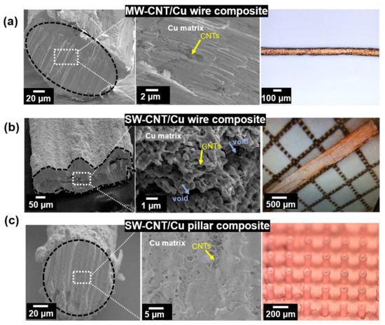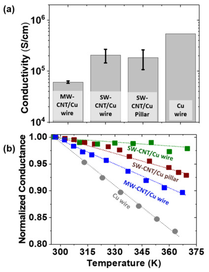 - Subramaniam, C.; Sekiguchi, A.; Yamada, T.; Futaba, D.N.; Hata, K. Nano-scale, planar and multi-tiered current pathways from a carbon nanotube–copper composite with high conductivity, ampacity and stability. Nanoscale 2016, 8, 3888–3894. [Google Scholar] [CrossRef] [PubMed]
