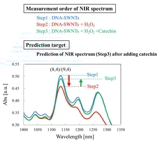 In this study, we considered the development of a deep learning model that can accurately predict experimental data from a small amount of training data. The data targeted by the NN model in the present study was from an experiment on the NIR absorption spectrum change of a DNA-SWCNT dispersion, reported by Matsukawa et al. []. It is known that the absorption peaks of chirality (8,4)/(9,4) SWCNTs decreases when H2O2, which is an oxidizing agent, is added to the DNA-SWCNTs’ dispersion []. (8,4)/(9,4) SWCNTs indicate that the absorption wavelengths for chirality (8,4) and (9,4) are almost the same. Matsukawa et al. have suggested the possibility of a biosensor that detects antioxidant activity because the peak amplitude is restored before oxidation when catechin, which has antioxidant properties, is added to oxidized DNA-SWCNTs, as shown in Figure 1. In order to put DNA-SWCNTs to practical use in biosensor applications, it is necessary to clarify the absorption spectra responses to detailed catechin concentration changes through more experiments. However, preparing many of these experiments is time consuming, costly and impractical. Thus, predictions with high accuracy, using machine learning from a small amount of experimental data, will contribute to efficient experiment planning in the future.