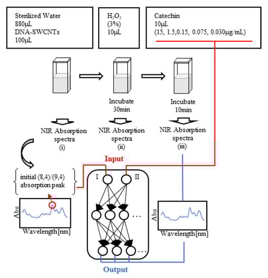 This section shows the sample of experimental data that was used for training and verification by the NN model. The SWCNTs were purchased from Raymor Industries Inc. (Boisbriand, QC, Canada). The double strand DNA (deoxyribonucleic acid sodium salt from salmon testes, D1626) was obtained from Sigma-Aldrich Co. LLC (St. Louis, MO, USA). Hydrogen peroxide (abt. 30%, 084-07441) and catechin (553-74471) were purchased from Wako Pure Chemical Industries, Ltd. (Osaka city, Osaka, Japan). A 1 mg/mL DNA solution was prepared with 10 mM tris (hydroxymethyl) aminomethane-HCl (Tris-HCL) buffer (pH 7.9). To untangle the DNA molecules, the solution was sonicated in a bath-type ultrasonicator (80 W) for 90 min on ice. Finally, the dsDNA solutions were gently shaken for 3 h. For preparation of the DNA-SWCNTs, 0.5 mg of SWCNT powder and 1 mL of the DNA stock solution were mixed and sonicated for 2 h using a probe-type sonicator (3 W, VCX-130, Sonic & Materials, Inc., Newtown, CT, USA) on ice. The supernatant of the prepared DNA-SWCNT dispersion was stored, after centrifugation at 17,360 g for 3 h at 8 °C. Then, 0.5 mg of SWCNTs were suspended in 1 mL of the DNA solution. The samples were sonicated using the probe-type sonicator (3 W) for 2 h, followed by centrifugation at 17,360 g for 3 h at 8 °C. The supernatants were collected as a DNA–SWNT suspension.