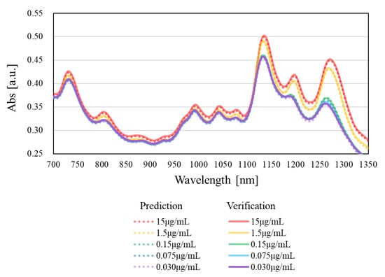 Comparison of the results of prediction data and verification data in the spectrum waveform after catechin addition for each catechin concentration.