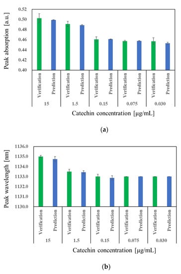 The data used for training the BRBPNN contains errors because it is experimental data. Therefore, in order to investigate the effect of the data errors used for training, we performed cross-validation in which the training data and the verification data were exchanged. The spectral waveform after catechin addition is predicted from the three BRBPNN outputs created for each catechin concentration and the absorption and wavelengths of the (8,4)/(9,4) peaks are shown in Figure 4a,b. It was confirmed that the error of the prediction result is about the same as that of the verification data with which it was compared. This result is considered to indicate that, even if the experimental data that trains the neural network has some variation, the prediction accuracy of the BRBPNN model is not significantly affected and a highly robust result can be obtained. The average ± standard deviation of the absorption and wavelength at each catechin concentration, as shown in Figure 4, is also shown in Table 1.