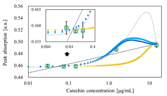 Prediction results of (8,4)/(9/4) absorption peaks for catechin concentration input using BRBPNN: The blue circles represent the BRBPNN model’s output from learned data. The orange circles represent the BRBPNN model’s outputs when the learned excluding the catechin 1.5 μg/mL. The light blue circles represent the BRBPNN model’s output when learned excluded the catechin 0.075 μg/mL. The green squares, black lines and gray dotted lines represent the validation data, the power approximation lines and the polynomial approximation lines (quadratic) for them, respectively.