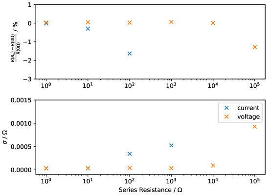 Influence of series resistance added to either current or voltage contacts of the Keithley DMM6500 for the four-wire measurement of a 14 resistor. (top): Relative change of measured resistance (bottom): Standard deviation of the acquired resistances in 10 .