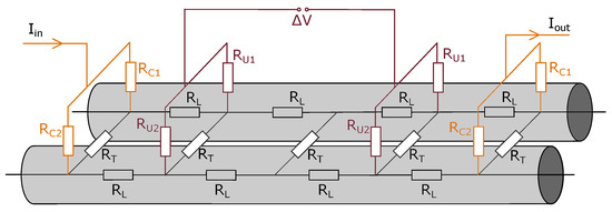 Contact resistance has to be further analyzed critically in the case of highly anisotropic materials such as CFRP. The reason for this can be explained using a maximally simplified model of a two-fiber sensor displayed in Figure 2. A LTspice model https://www.analog.com/en/design-center/design-tools-and-calculators/ltspice-simulator.html (accessed on 21 September 2021) that demonstrates the following discussion is attached as a digital supplementary file to this article.