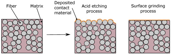 In order to achieve electrical contact to the conductive fiber network of a CFRP, the carbon fibers have to be exposed on the surface of the material. Excessive resin rich surface zones occurring frequently in CFRP manufacturing processes electrically isolate the fibers and therefore have to be removed. Different methods to achieve this have been proposed in the past. Many authors [8,9] use abrasive paper of various grid sizes to clean the surface of the CFRP, which not only abrades matrix material but also the fibers themselves [10,11]. Other authors use concentrated sulphuric acid [7] or laser ablation [12] to prepare the surface while minimizing fiber damage.