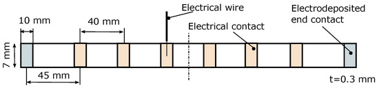 Another commonly used contacting technique is the electrodeposition of various metals onto the conductive fibers. Table 2 summarizes the different contacting materials based on electrodeposition used in this article. Two types of plating materials are tested. Electroplating is performed in a plating bath according to the manufacturer’s recommendations. First adhesive tape is wrapped around the specimen at all positions that have to be submerged into the electrolyte but should not get any metal deposited. Next, the surface of the specimen is prepared as described in Section 3.1. The specimen is then clamped on one end between two copper sheets for electrical contact during electrodeposition. The other side of the specimen is then submerged into the electrolyte. Next, a current that results in a current density as described in Table 2 is set in a constant current source and the specimen is electroplated for the specified time. Due to the complex surface topology of CFRP with fibers exposed on the surface, it is difficult to precisely quantify the surface area. For simplicity, the surface area is calculated using the macroscopic dimensions of all surfaces where metal is deposited in this article. The same electroplating procedure is then repeated on the other side of the specimen. Finally, if not stated otherwise, electrical contact to the deposited metal is generated by soldering a wire to it with a standard soldering iron.