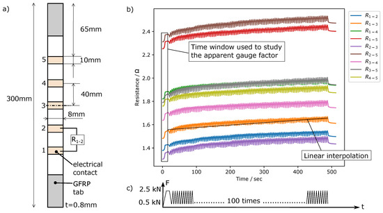 The change of electrical contact resistance of various contacting methods due to strain is analyzed using two-wire measurements. Pultruded rods with a cross section of approximately () are used. GFRP tabs are glued to the specimen in order to clamp the specimen into a universal testing machine. Figure 5a) shows the specimen dimensions used in this study. Figure 5c) shows part of the strain cycle used for all specimens, where the specimen is first strained and kept under strain for some seconds. Afterwards, the specimen is repeatedly tensioned and released. All CFRP rods are strained with a universal testing machine with 200 cycles and a maximum strain of %. A total of six different specimens are analyzed in these dynamic experiments. A total of five electrodes are painted or electroplated onto the lateral surface of the CFRP part. All electrode combinations are connected to a SCAN2000 multiplexer circuit and fed into a Keithley DMM6500 to allow for a quasi-simultaneous measurement of all contact pairs. The change of two-wire resistance of all contact pairs is used to estimate the change of contact resistance throughout the measurement.