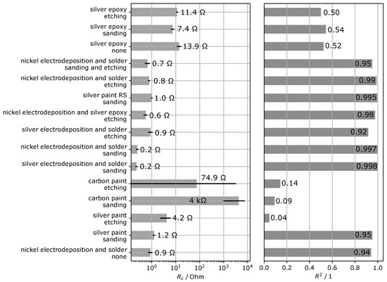 The contact resistances and coefficients of determination obtained with the methods described in Section 3.4 are displayed in Figure 6. The figure shows large differences between the contact resistances of the specimen that require a logarithmic scale for displaying purposes. Furthermore, the 95% confidence interval for the contact resistance as obtained from the linear approximation of the sample is displayed.