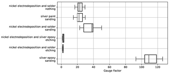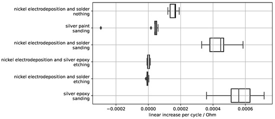 Next to the analysis of the irreversible resistance change over the cycles, the results displayed in Figure 5 also allows us to calculate the reversible resistance change due to strain. This reversible resistance change can be correlated with the mechanical strain to calculate the apparent gauge factor of the experimental setup. Figure 8 shows the calculated apparent gauge factor for all specimen analyzed in this section. The values are calculated using the initial resistance increase at the beginning of the experiment. Thus, nonlinearities or changes during the strain cycles are not analyzed in this simplified overview. The apparent gauge factor is different between contacting methods. Overall, three groups can be differentiated from the results. Etched surfaces and electrodeposited contacts show the smallest apparent gauge factors. Silver epoxy used on a sanded surface on the other hand shows by far the largest apparent gauge factor. The remaining three variants lie between both of these methods.