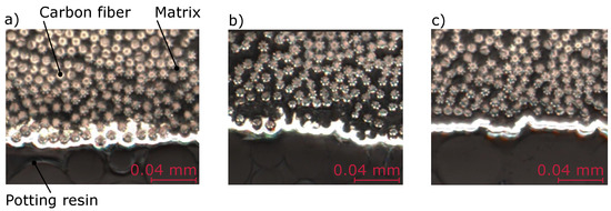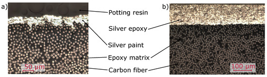 Throughout this study, microscopic cross section analyses are performed to assess the interface between electrical contact and CFRP in detail. For this, specimens with similar contact preparation techniques are manufactured separately and cut at the cross section of interest with a rotary cutter. These smaller specimens are then embedded in acrylic (Struers ClaroKit) and polished with a typical polishing cycle using an automated polishing system (Struers Tegramin-30). The specimens are then analyzed using general purpose microscopes.
