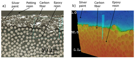 For these electrodeposited specimens, sanded surfaces show smaller contact resistances when compared to etched surfaces. Figure 12 shows microscopic images of a sanded and an etched surface with the most obvious difference observed between these groups. In some cases, the etching process removes carbon fibers from the matrix. This phenomenon does not occur in the case of the sanding process because sanding abrades the fibers instead of removing only the matrix. This, however, does not seem to be a directly plausible explanation for the larger contact resistance of etched surfaces. It is possible that electrode delaminations occur more frequently for etched surfaces because of loose fibers that are not embedded into the polymer. It is also possible that the loose fibers inhibit the ion transport in the electrolyte to the underlying surface fibers which reduce the metal deposited to the direct surface of the part. Both explanations would reduce the electrical contact area to the direct surface and thereby increase the contact resistance. These hypotheses are however difficult to evaluate based on cross section images, because they inherently only allow evaluating single cross sections and not the full interface area. Furthermore, as displayed in Figure 11b), the preparation process itself is likely to be the cause of at least part of the delaminations observed. In future work, it would be possible to further evaluate this by using Micro-CT scans that analyze the interface area without needing to cut the material or by improving the cutting and embedding process. Improving this could also help to find optimal parameters for the electrodeposition of contacts to CFRP.
