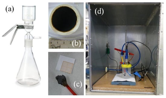 Digital photographs of glass funnel for vacuum filtration (a), vet sample after vacuum filtration of solution through PVDF membrane (b), rGO-PC paper connected to electrode (c) and home-made electrochemical cell used for the measurements of the single electrode in electrolyte (d).