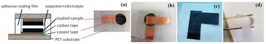 The structure of the assembled supercapacitor (a) and digital photographs of SCs on PET with Cu and C tapes (b) and PET with graphite ink (c). Image of the fabricated SC presenting its flexibility (d).