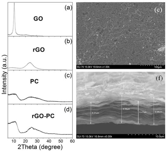 The XRD profile of the vacuum-filtrated rGO-PC freestanding paper is presented in Figure 3, together with the data for the GO, bare rGO paper prepared by the same process and bare polycarbonate film obtained from the corresponding solution on glass substrate for comparison. The strong peak at ~10.4°, which is characteristic for GO, is shown in Figure 3a,b to disappear after vacuum annealing at 180 °C, while a broad rGO peak at ~24° appeared. The final composite XRD pattern includes both weak rGO response of rGO shown in Figure 3b and dominant response of PC shown in Figure 3c without any extra reflections as seen in Figure 3d. The morphology of the rGO-PC film in the plane-view SEM image is presented in Figure 3e, revealing that the components are mixed. According to the cross-section SEM micrograph shown in Figure 3f, the thickness of the composite paper is 7 ± 1 μm.