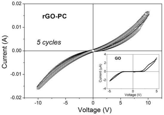 I–V plot of rGO-PC freestanding paper at 5 cycling measurements. Inset shows I–V of GO paper.