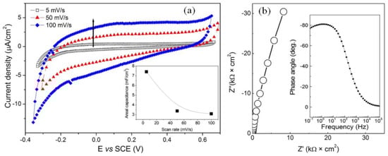 where A is the area of the electrode material; v is the potential scan rate; V2 − V1 is the potential window; and I(V) is the response current at voltage V under CV operation. As can be seen from Figure 1c, the studied material is slightly brittle, and some difficulties appeared during the connection of the material as the working electrode. The area of the electrode was also not easy to determine; however, it was calculated according to the graph paper (also shown in photo of Figure 1c). According to Equation (2), the areal capacitance from CV for the rGO-PC electrode was calculated as ~7.5, 3.4 and 3.1 mF/cm2 at 5, 50 and 100 mV/s, respectively (see inset of Figure 5a).