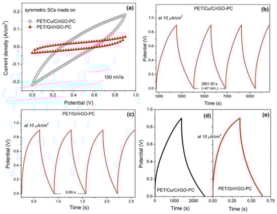 The CV curves for rGO-PC on PET/Cu/C and on PET/GrI are shown in Figure 6a. The CV curves for both SCs are not ideally rectangular, indicating also that the material charges and discharges quickly and efficiently. The CV of the SC made on PET/GrI is more rectangular, but its area, as well as corresponding capacitance, is smaller than that of the SC using PET/Cu/C as a support for rGO-PC. The specific capacitance of the full SC was calculated from CV using Equation (3):